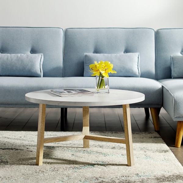 Manor Park Mid Century Modern Round Coffee Table White Marble Light Oak Walmart Com Walmart Com